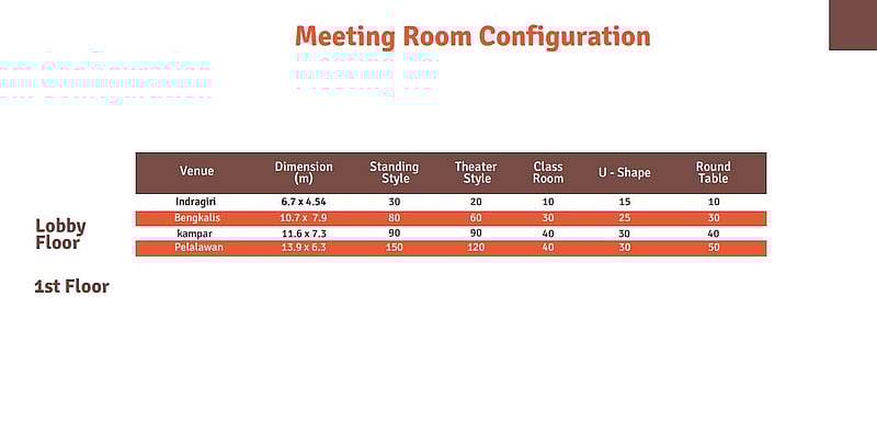 - Fasilitas pertemuan yang lengkap dengan peralatan meeting berstandard internasional. Terdiri dari 23 meeting room dengan kapasitas mulai dari 50 - 800 orang yang dapat disesuaikan dengan kebutuhan meeting Anda